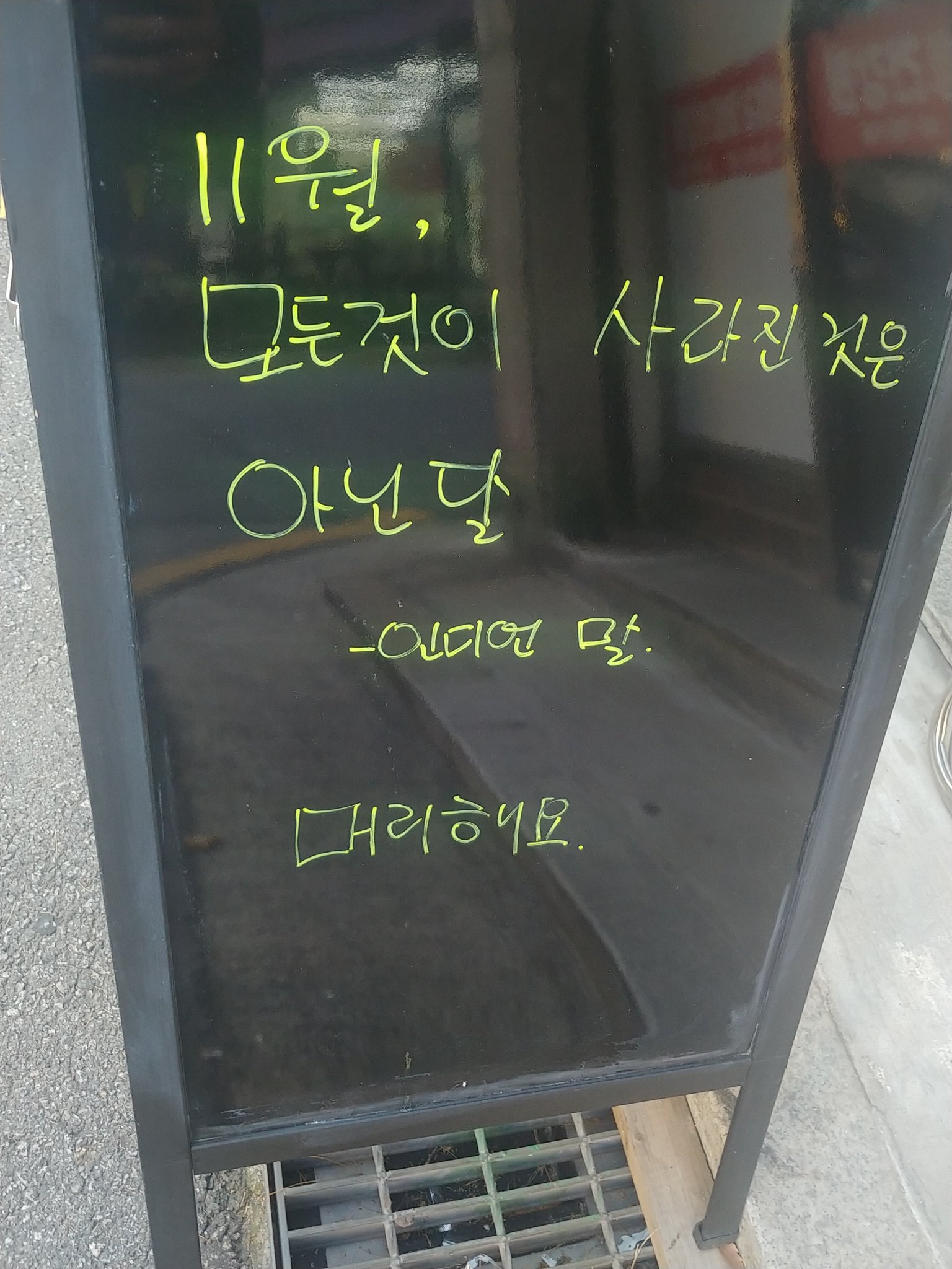 241106 종말학습관에서 3시간 작업하고 단백질음료 마시고 상체운동하고 죽순도서관에서 또 3시간 작업 - 총 2천2백자를 썼다. 웬일이여!? / T순대국집에서 순대정식을 먹었다. 깔끔하고 정갈하고 직접 만든 순대맛이 일품이었다. '60년 전통 외길 순대인생'이 이마에 써진 듯한, 과묵하고 무뚝뚝해뵈는 사장님 부부의 솜씨. 계산할 때 고마워요! 하고 인삿말을 툭 던지는 할머니 사장님이 귀엽다고 생각. 벽걸이 TV에선 트럼프 당선을 알리는 뉴스가 흘러나왔다. / 황망하게 골목을 걷다 어느 미용실 입간판을 발견하고 감동.